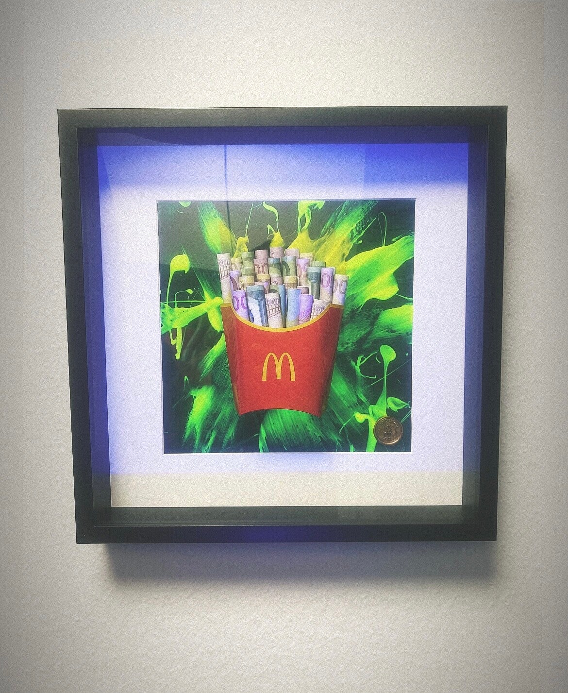 Ein einzigartiges Pop-Art-Kunstwerk mit Wow-Effekt! Die ikonische McDonald’s Pommes-Verpackung, gefüllt mit Geldscheinen, wird durch ein leuchtendes, modernes Design perfekt in Szene gesetzt.